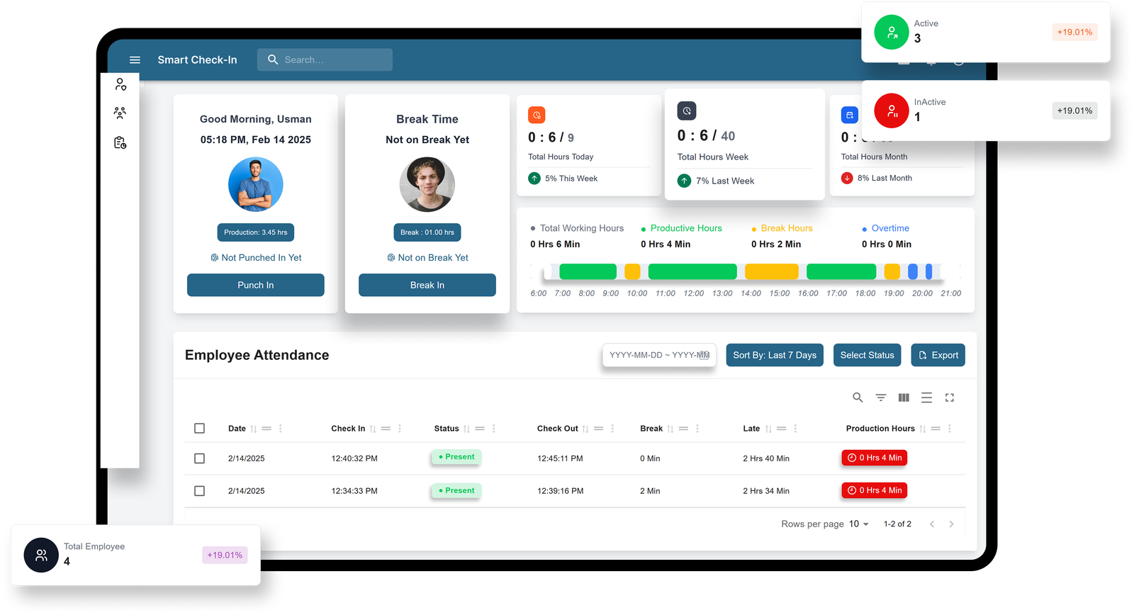 ✅ Working Hours & Productivity Tracking – Get detailed insights into total working hours, productive hours, break time, and overtime.