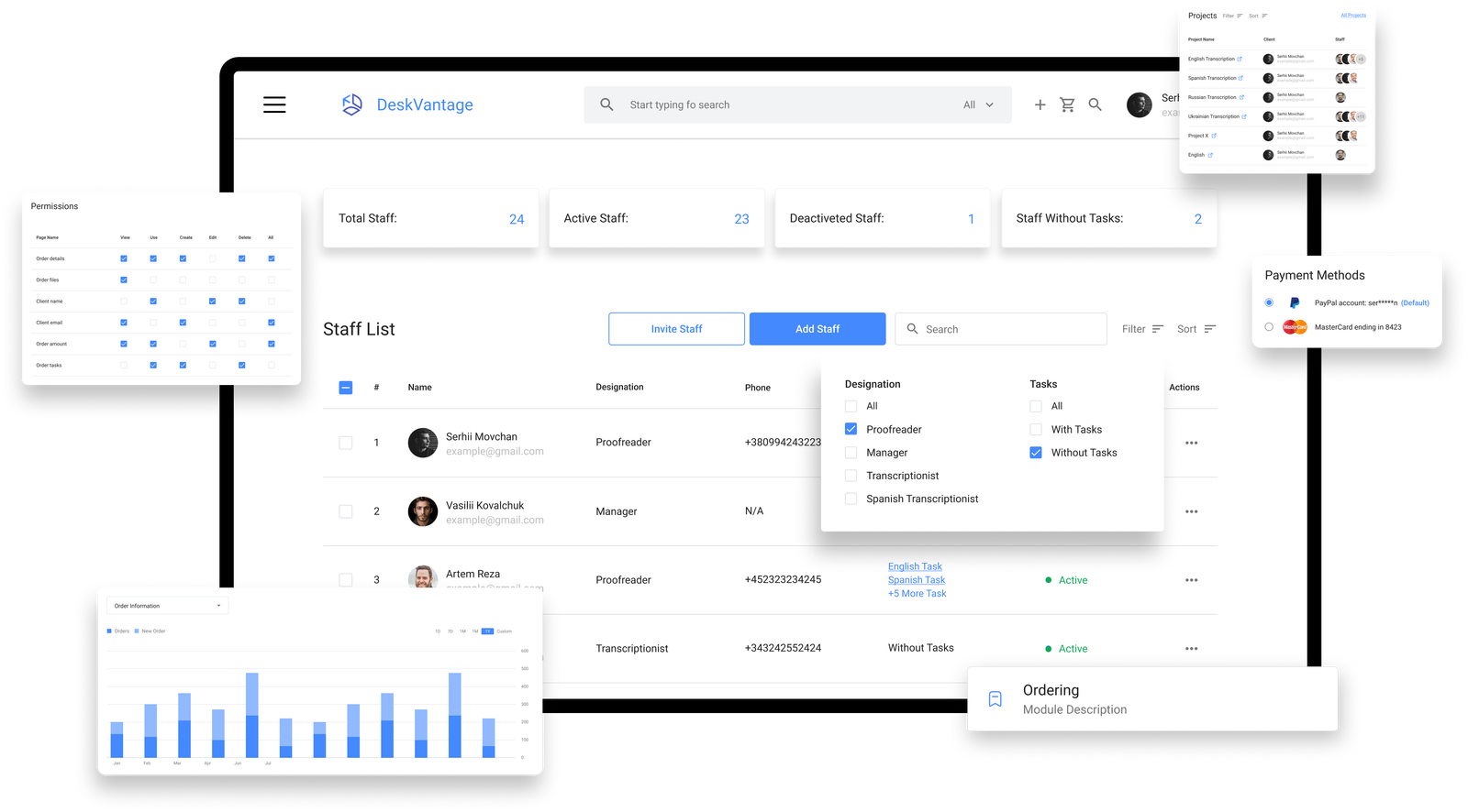 DeskVantage is a robust SaaS platform designed to streamline staff, client, and sub-user management with advanced role-based access control. This powerful system provides businesses with full control over permissions, user roles, and reseller management, ensuring secure and efficient workflow operations.